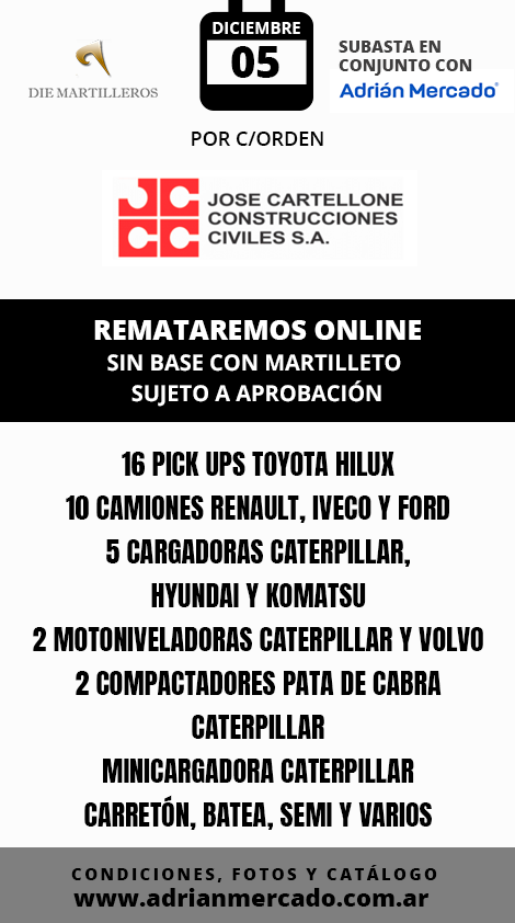 | 35 | Camión Iveco Tector Attack E5 260E30 con caja volcadora, año 2018, dominio AC 641 QS, 3.000 hs de uso aprox., no tracciona | ![]() |